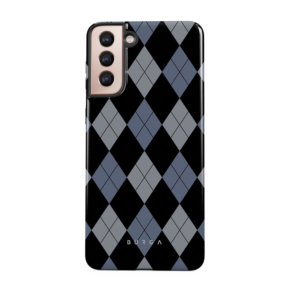 Discover our Trouble Samsung Galaxy S21 Plus phone case design—a classic argyle pattern featuring stark black diamonds that seamlessly blend with two distinct shades of blue. Made for those who respect the classics but aren't afraid to disrupt the norm.