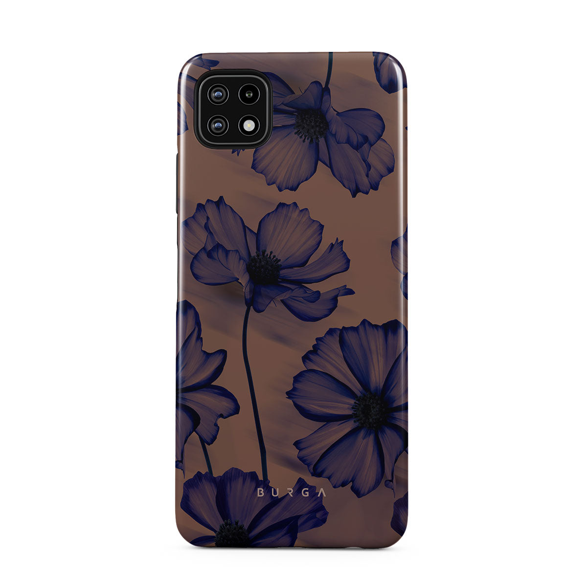 Discover our Velvet Night design. On a soft nude backdrop, blue poppies dance in the untamed rhythm of the wind. A blend of night's peace and daring energy, this Samsung Galaxy A22 5G phone case is perfect for those who dream big and seek adventure.