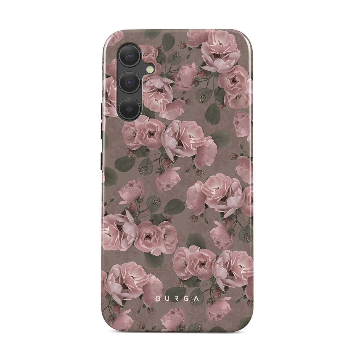 Blush, blooming roses transport you to an era of silent film stars and secret gardens. Our sophisticated Vintage Glamour Samsung Galaxy A34 phone case design is perfect for the romantic at heart. It's for those who speak in glances and sighs and find comfort in the nostalgic whispers of floral romance.