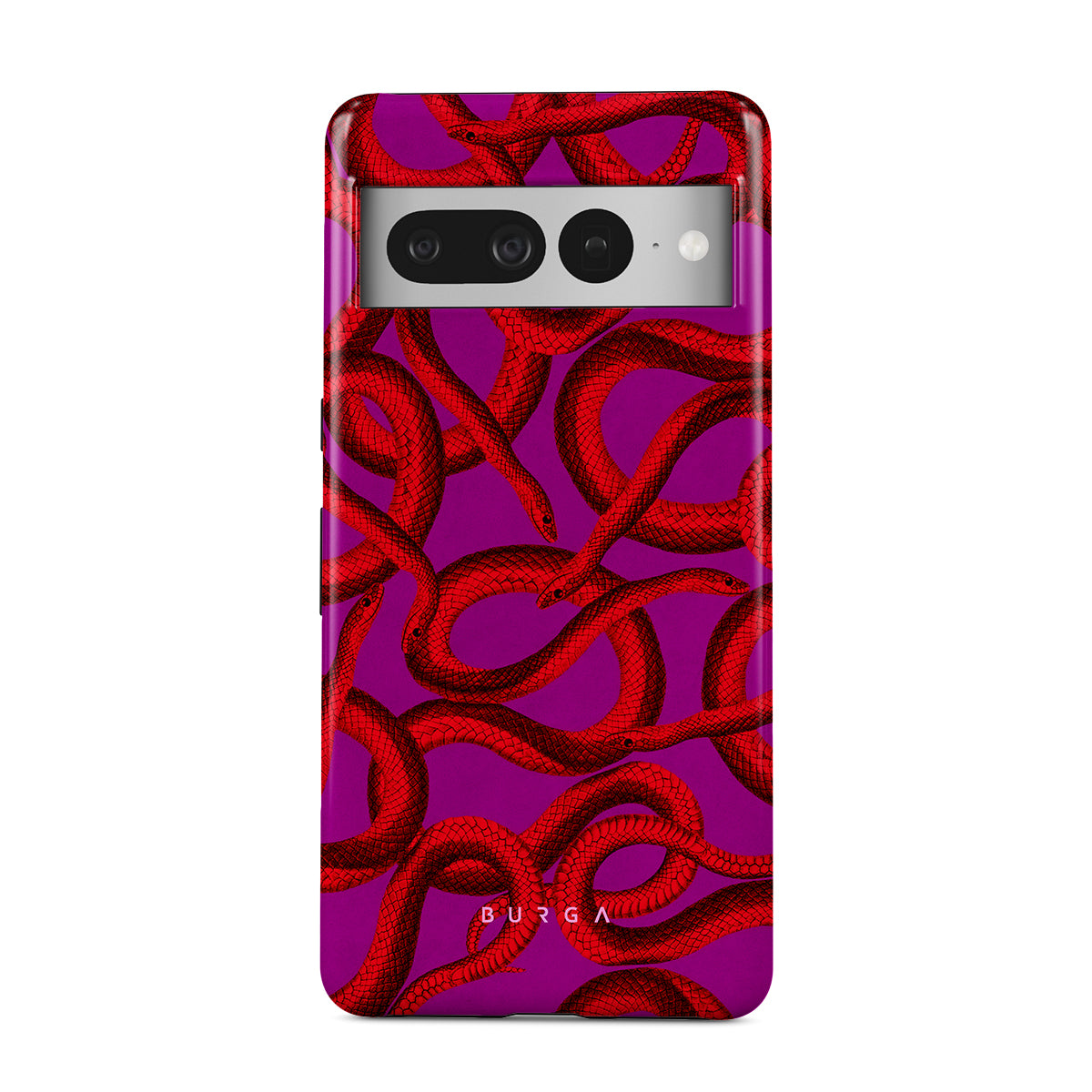 Watch Out Google Pixel 7 Pro phone case design offers a fierce feel with a bright magenta colored background covered in red snakes pattern. Make a statement while protecting your phone, as this case is guaranteed to catch everyone's eye.