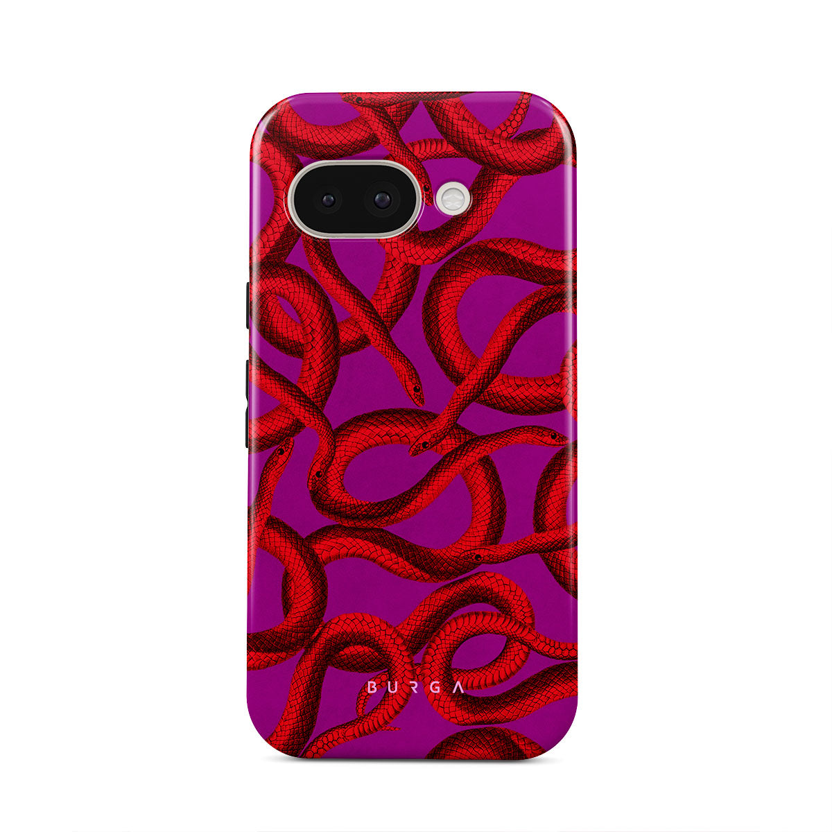 Watch Out Google Pixel 9a phone case design offers a fierce feel with a bright magenta colored background covered in red snakes pattern. Make a statement while protecting your phone, as this case is guaranteed to catch everyone's eye.