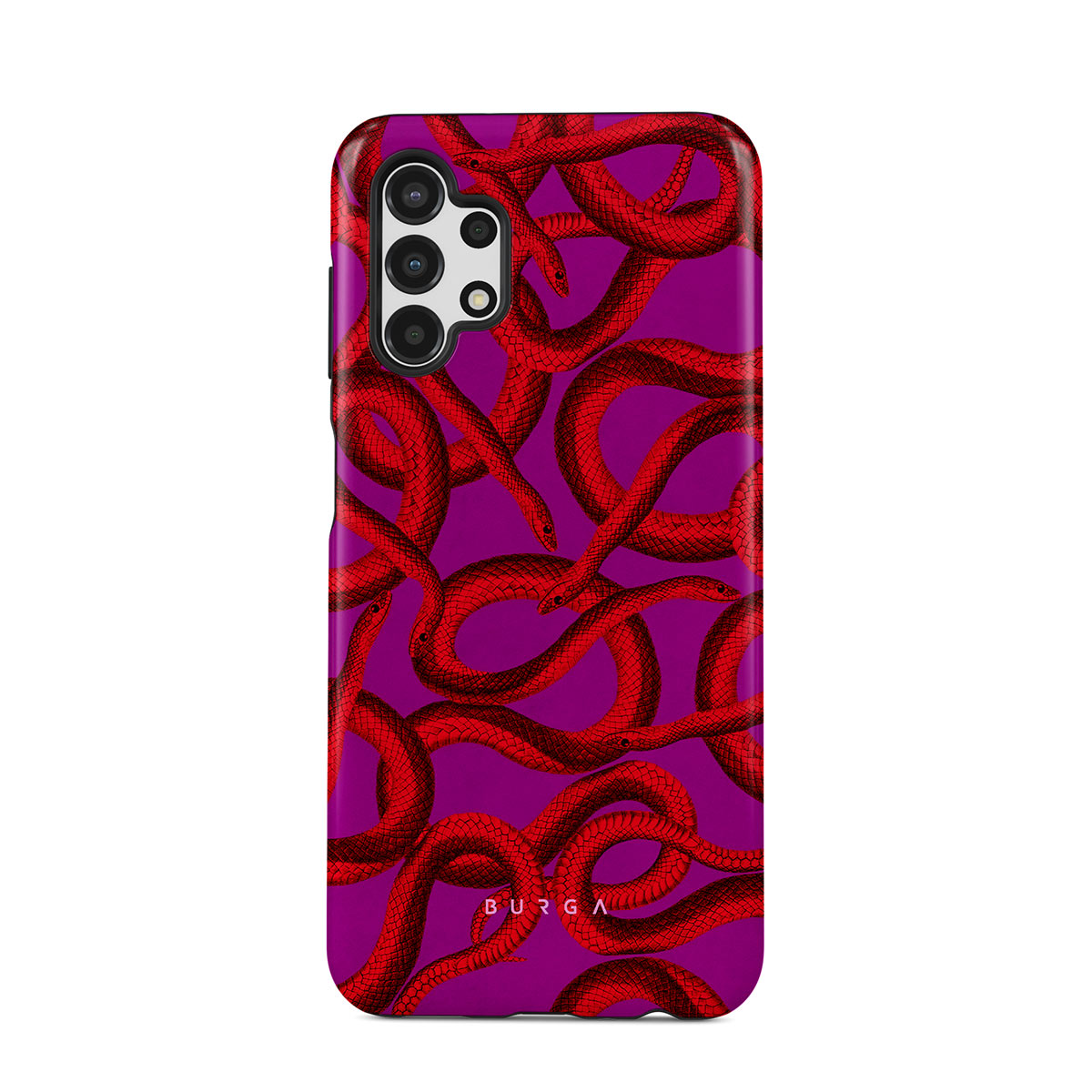 Watch Out Samsung Galaxy A13 4G phone case design offers a fierce feel with a bright magenta colored background covered in red snakes pattern. Make a statement while protecting your phone, as this case is guaranteed to catch everyone's eye.