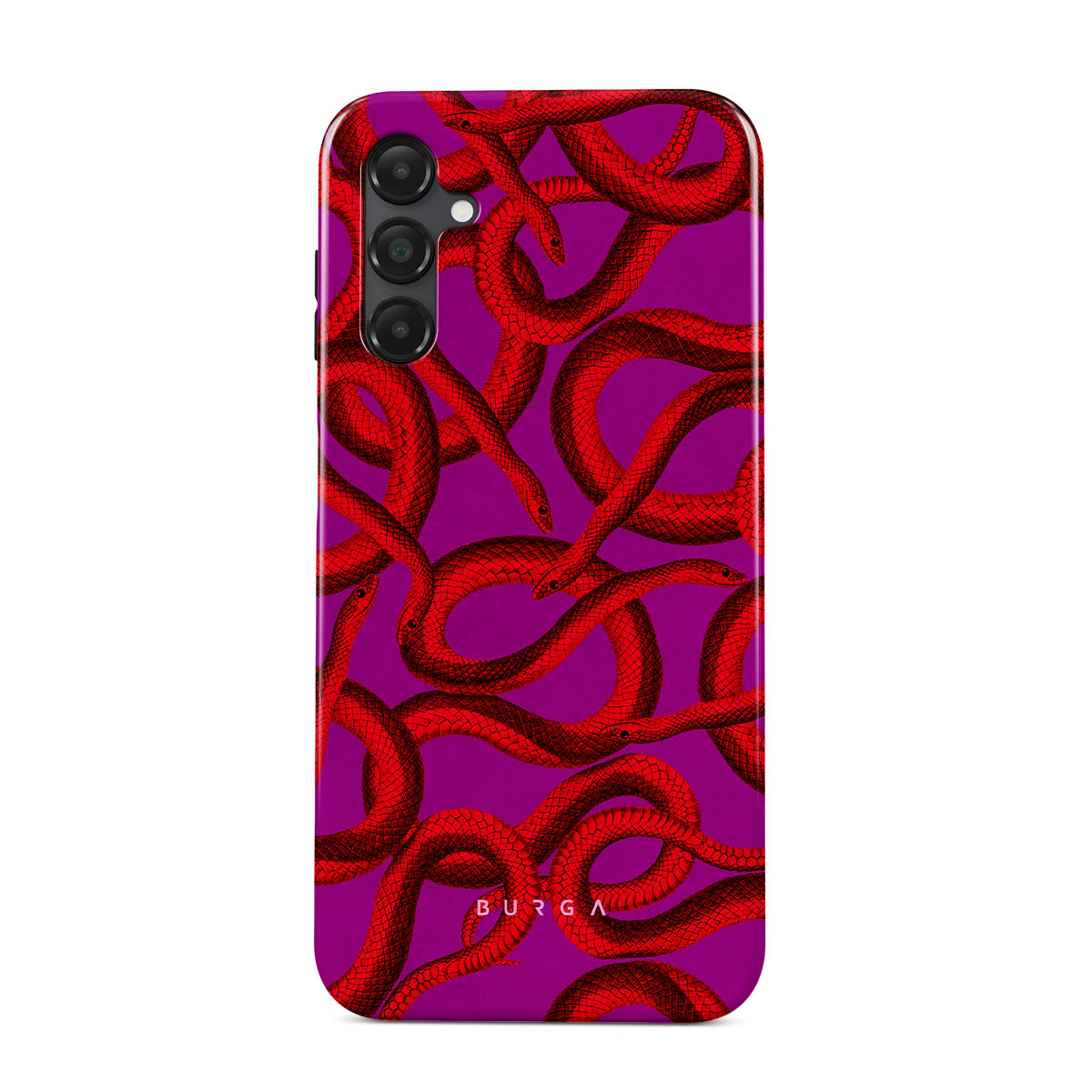 Watch Out Samsung Galaxy A25 phone case design offers a fierce feel with a bright magenta colored background covered in red snakes pattern. Make a statement while protecting your phone, as this case is guaranteed to catch everyone's eye.