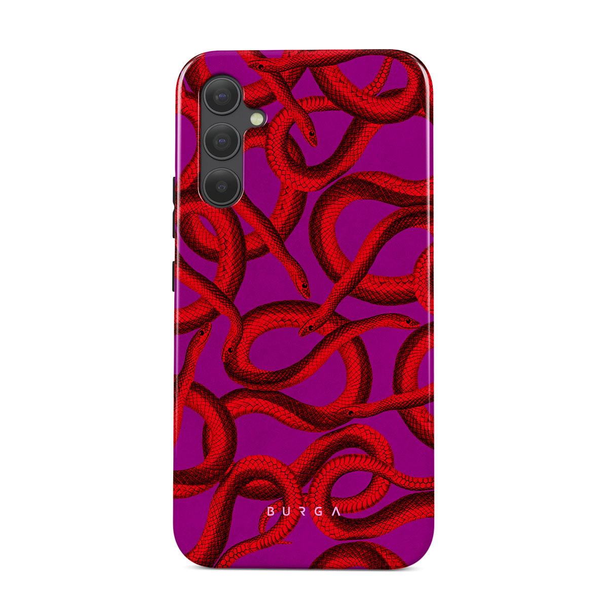 Watch Out Samsung Galaxy A34 phone case design offers a fierce feel with a bright magenta colored background covered in red snakes pattern. Make a statement while protecting your phone, as this case is guaranteed to catch everyone's eye.