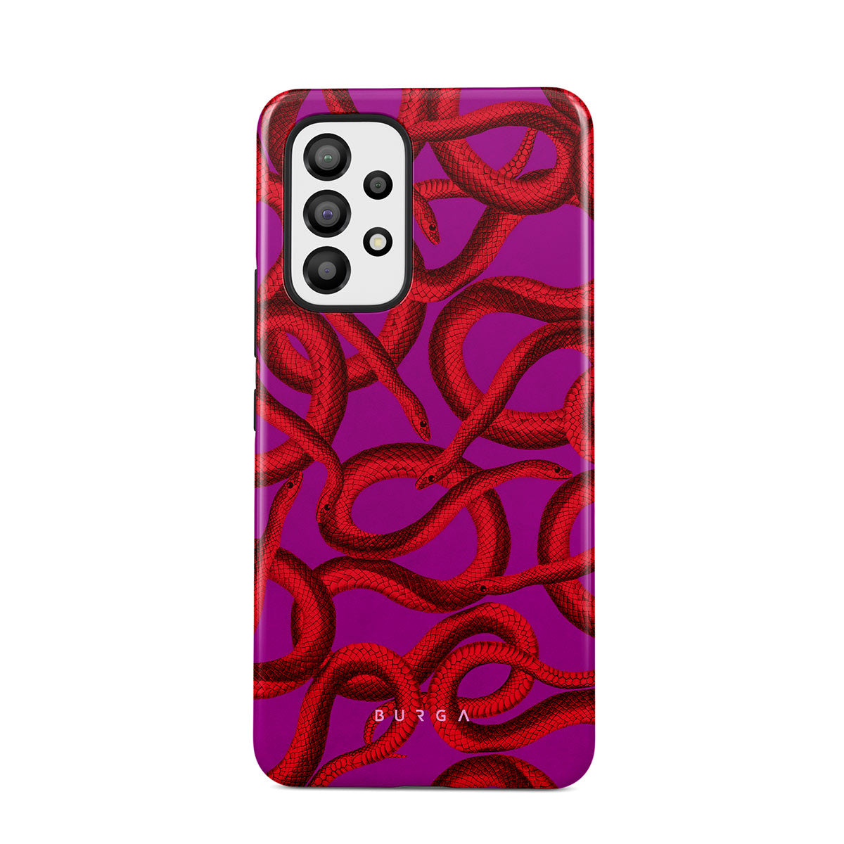 Watch Out Samsung Galaxy A72 phone case design offers a fierce feel with a bright magenta colored background covered in red snakes pattern. Make a statement while protecting your phone, as this case is guaranteed to catch everyone's eye.