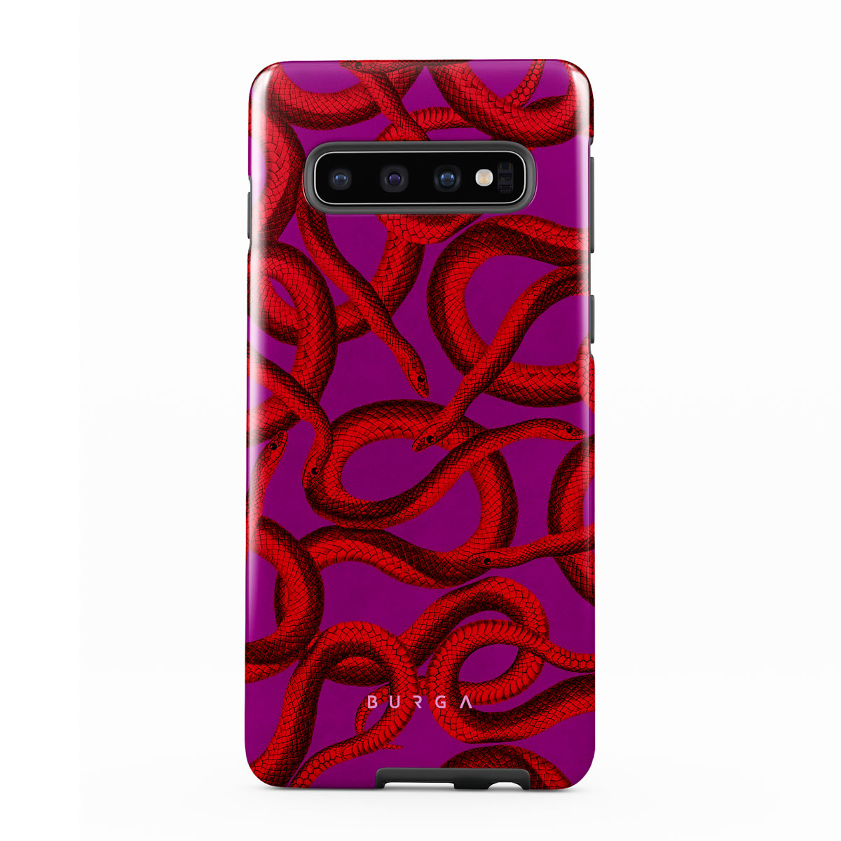 Watch Out Samsung Galaxy S10 phone case design offers a fierce feel with a bright magenta colored background covered in red snakes pattern. Make a statement while protecting your phone, as this case is guaranteed to catch everyone's eye.
