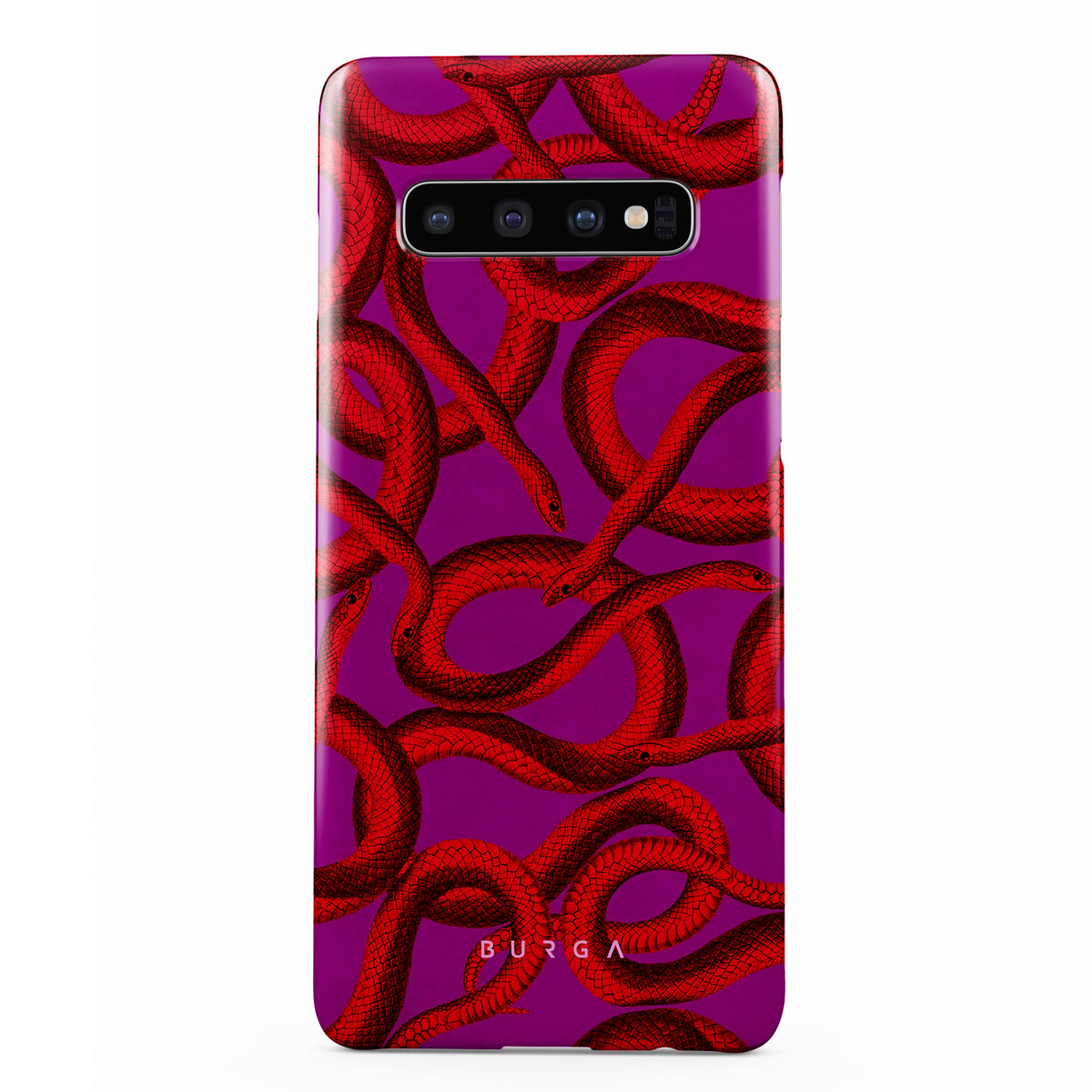 Watch Out Samsung Galaxy S10 Plus phone case design offers a fierce feel with a bright magenta colored background covered in red snakes pattern. Make a statement while protecting your phone, as this case is guaranteed to catch everyone's eye.