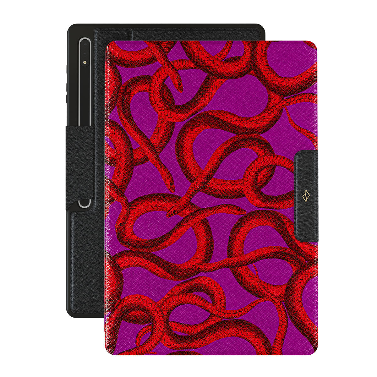 Watch Out Samsung Galaxy Tab S8 Ultra folio case design offers a fierce feel with a bright magenta colored background covered in red snakes pattern. Make a statement while protecting your Galaxy Tab, as this case is guaranteed to catch everyone's eye.