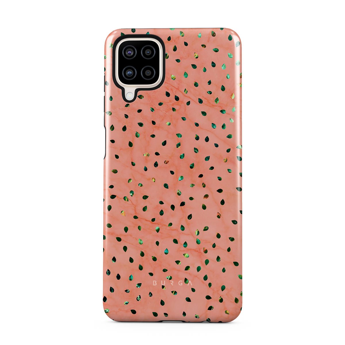 The Watermelon Shake Samsung Galaxy A12 4G phone case offers a playful take on design merging. The watermelon seed-like specks showcase striking tropical design fragments that add a splash of color to the fresh and breezy coral pink marble. This way, the funny protective phone cover becomes a perfect statement piece for your summer outfits.