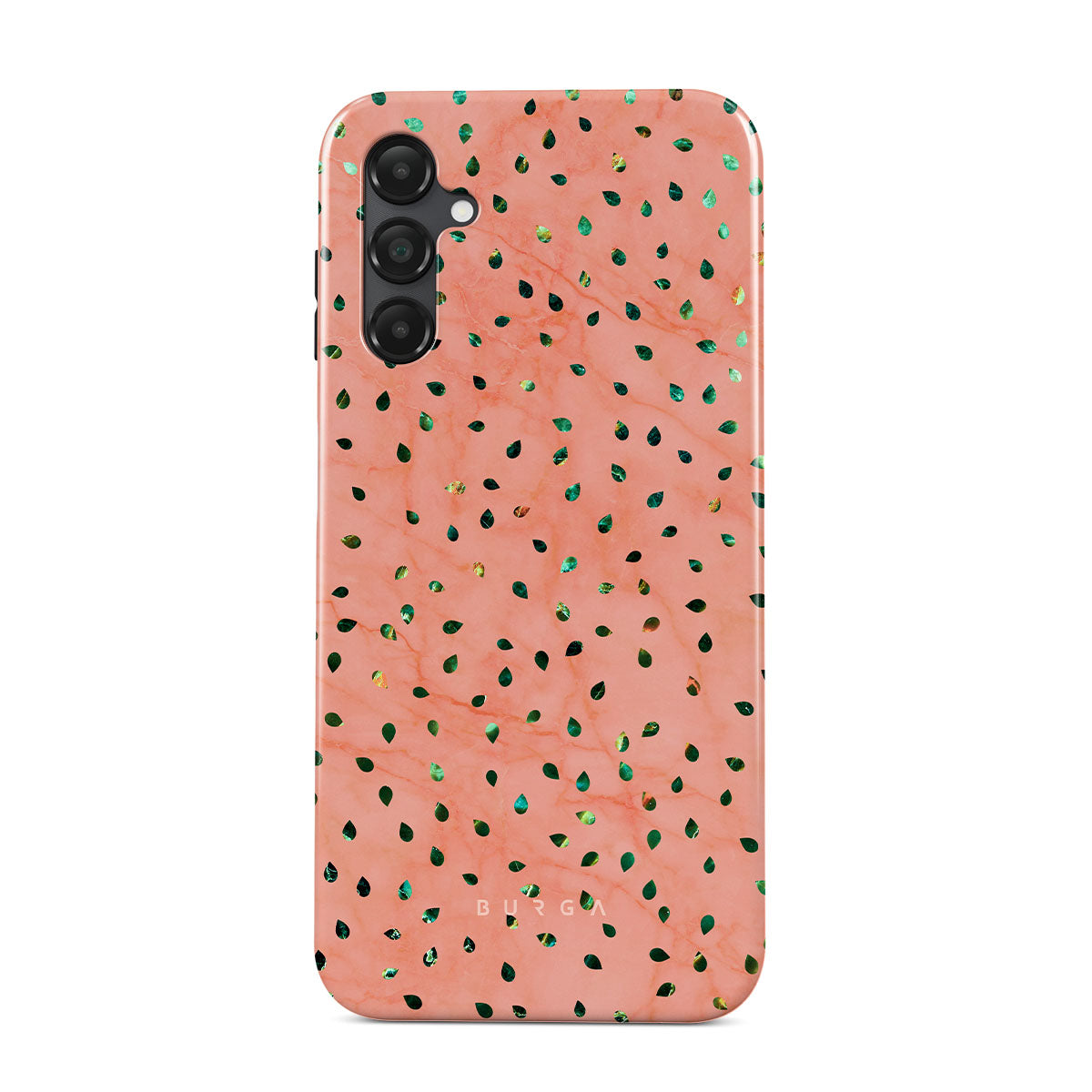 The Watermelon Shake Samsung Galaxy A14 5G phone case offers a playful take on design merging. The watermelon seed-like specks showcase striking tropical design fragments that add a splash of color to the fresh and breezy coral pink marble. This way, the funny protective phone cover becomes a perfect statement piece for your summer outfits.