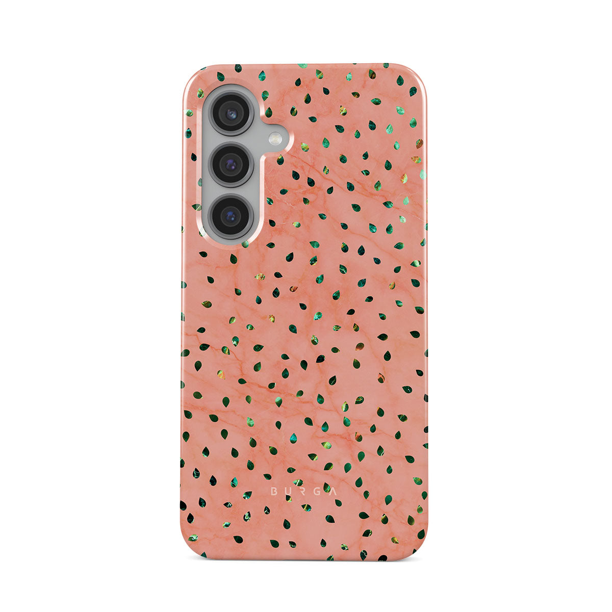 The Watermelon Shake Samsung Galaxy S24 FE phone case offers a playful take on design merging. The watermelon seed-like specks showcase striking tropical design fragments that add a splash of color to the fresh and breezy coral pink marble. This way, the funny protective phone cover becomes a perfect statement piece for your summer outfits.