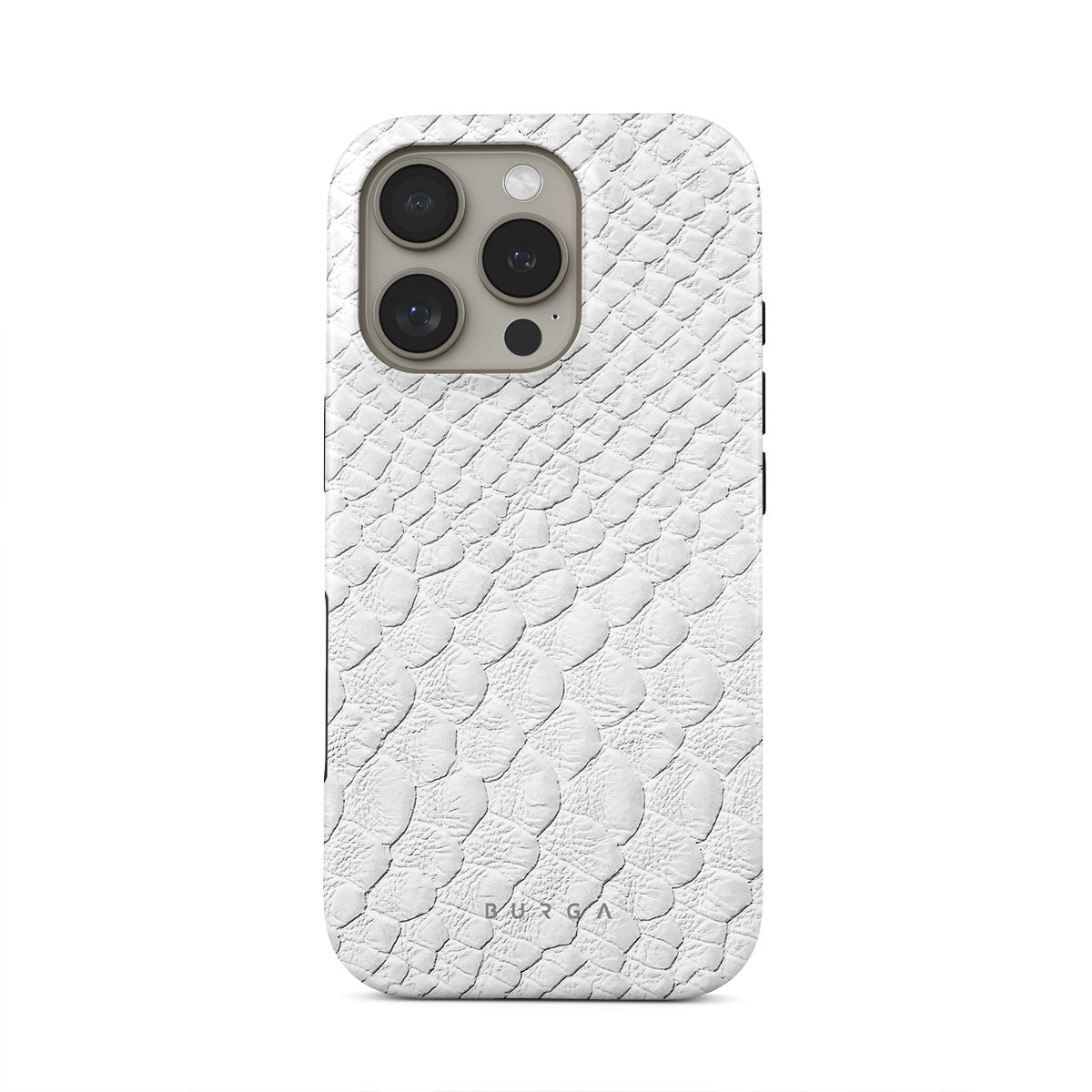 Glacial Desert iPhone 16 Pro phone case features snakeskin design in glacial white color. The dangerous animal print will add confidence and a touch of luxury to your style while transforming your phone into a fashion accessory.