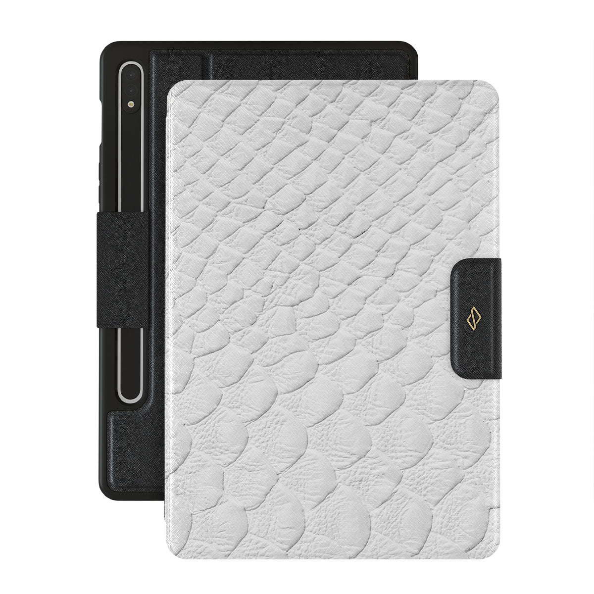 Glacial Desert Samsung Galaxy Tab S9+ folio case features snakeskin design in glacial white color. The dangerous animal print will add confidence and a touch of luxury to your style while transforming your Galaxy Tab into a fashion accessory.