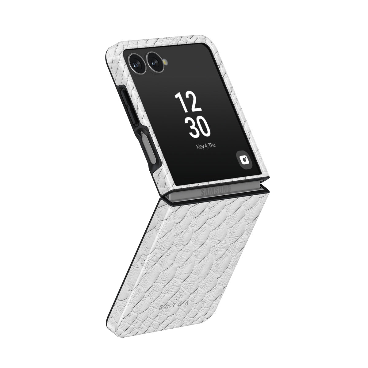 Glacial Desert Samsung Galaxy Z Flip 7 phone case features snakeskin design in glacial white color. The dangerous animal print will add confidence and a touch of luxury to your style while transforming your phone into a fashion accessory.
