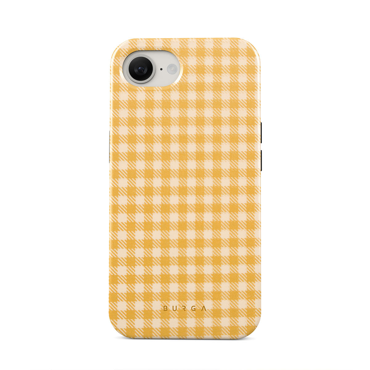 Always fashionable and always inviting, the Preppy Vichy fabric returns in our Tuscan Sun iPhone 16e phone case. The brightness and warmth of this enchanting yellow plaid design indeed remind us of the always generous Tuscan Sun. You can add a piece of this playful squares pattern with you while keeping your phone out of harm's way!