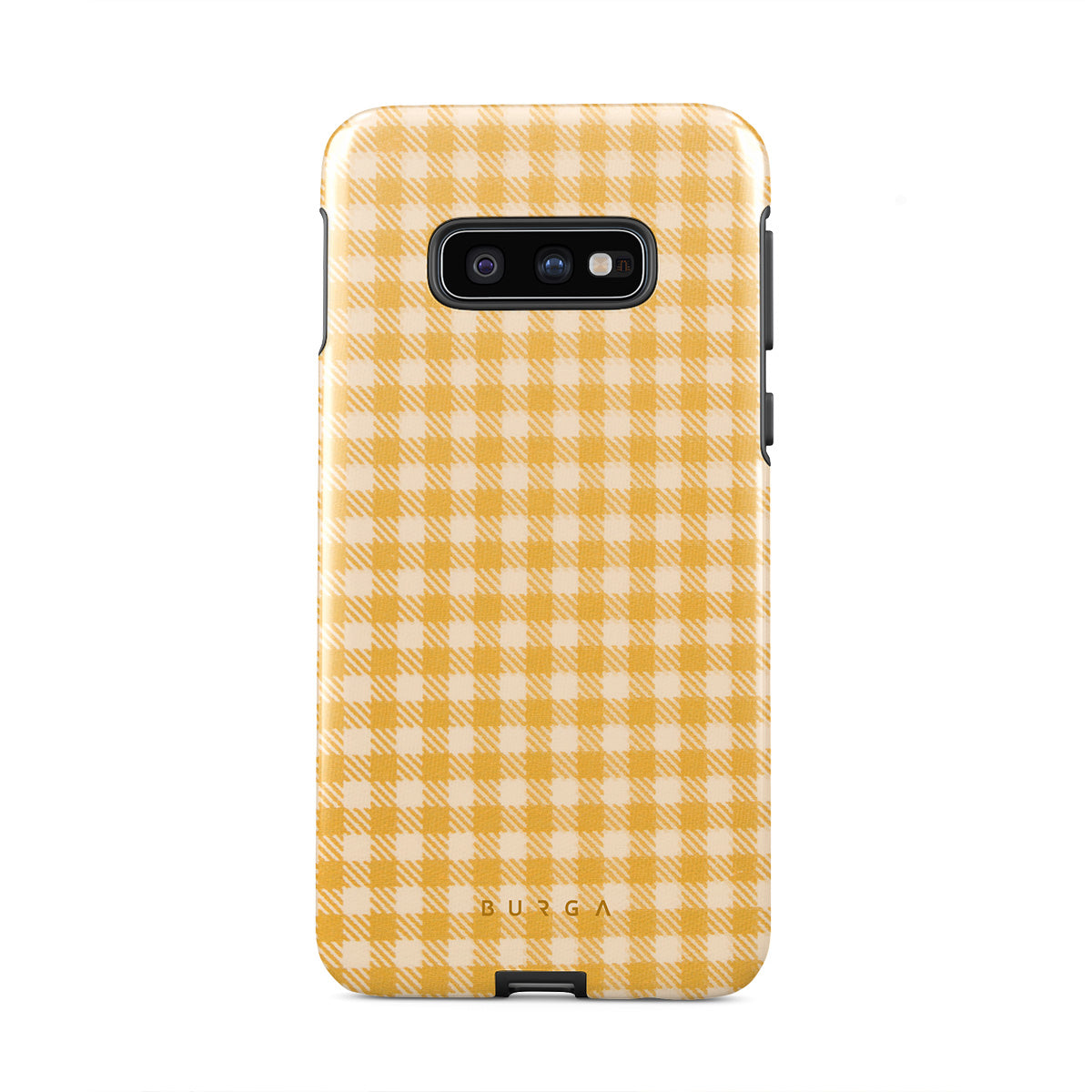 Always fashionable and always inviting, the Preppy Vichy fabric returns in our Tuscan Sun Samsung Galaxy S10E phone case. The brightness and warmth of this enchanting yellow plaid design indeed remind us of the always generous Tuscan Sun. You can add a piece of this playful squares pattern with you while keeping your phone out of harm's way!