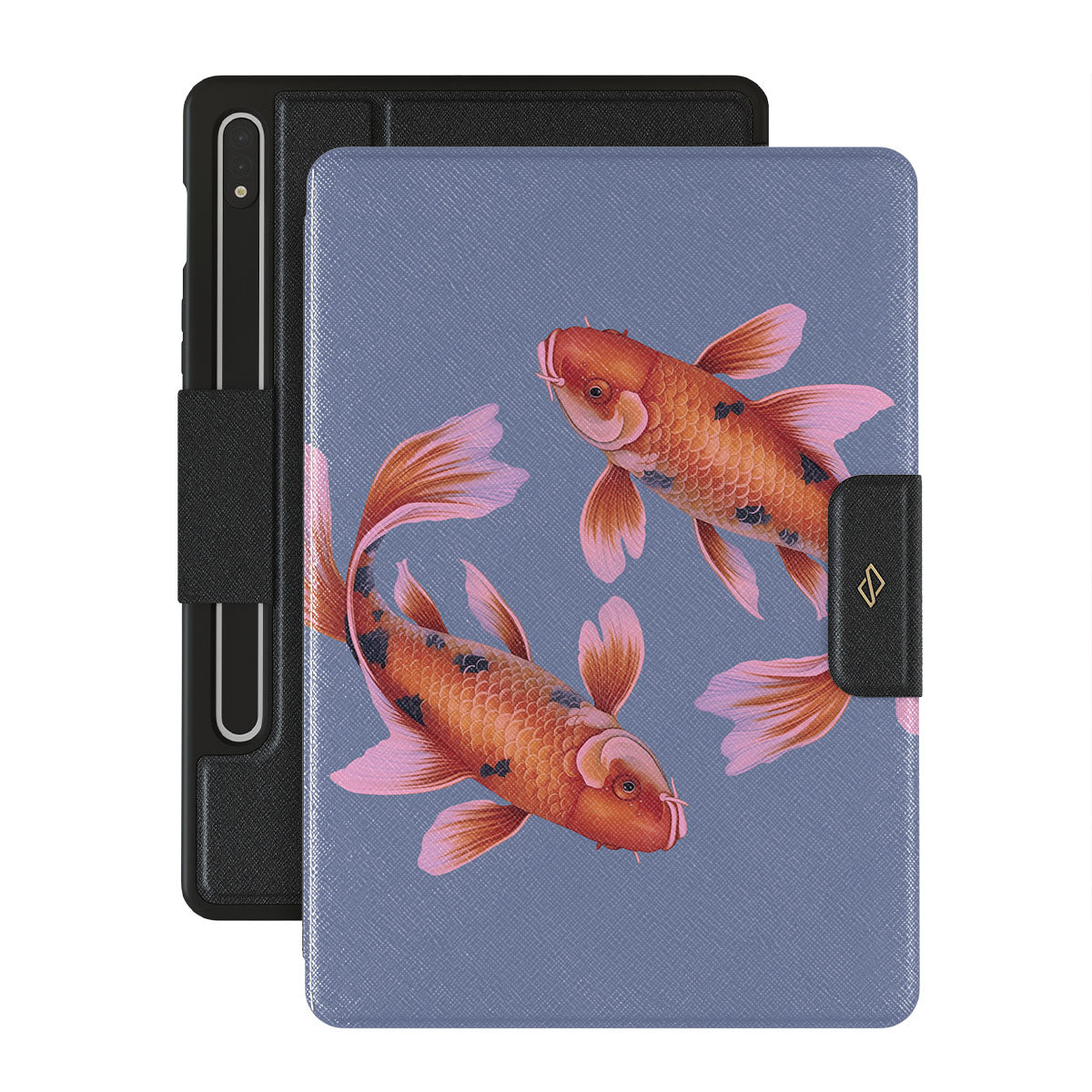 In the embrace of serene blue, the golden koi swirl, a symbol of life's fluid nature and the grace of going with the flow. Their dance is a serene meditation on the currents of destiny and the elegance of adapting with purpose. Discover our Zen Samsung Galaxy Tab S10+ folio case design.